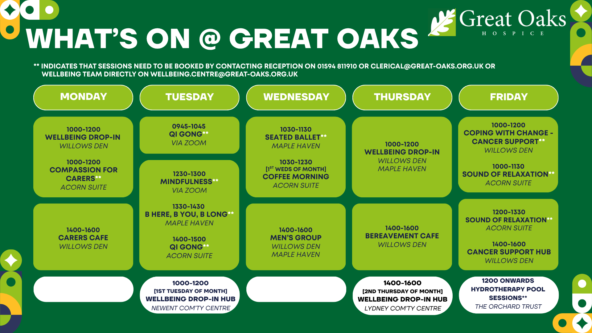Our "What's On at Great Oaks?" timetable shows the regular services and activities that are being offered on a weekly basis.